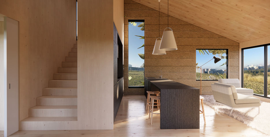 The transition from outdoors to blonde recycled plywood upon entering the home indicates you have stepped into a gentle place of calm. The palette of the interior bares many similarities to the external landscape. This carries the eye outward and gives the illusion that the space extends into the surrounding nature, not confined to the structure of the building.